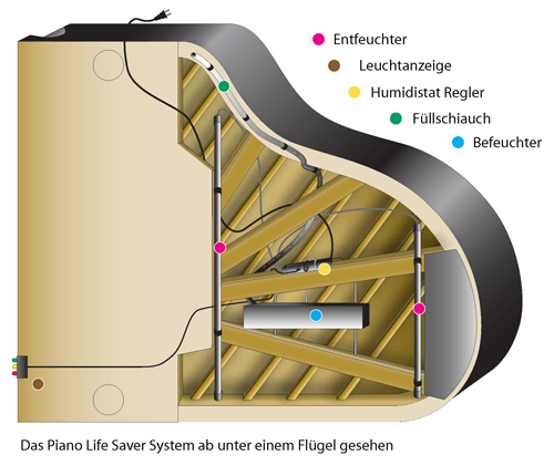 Das Piano Life Saver System ist lautlos und wird außerhalb des Sichtbereichs in Ihrem Flügel angebracht. Jedes Piano Life Saver System kommt mit einer 5-jährigen Garantie, die nur wirksam wird, wenn das System durch einen Klaviertechniker installiert wird.