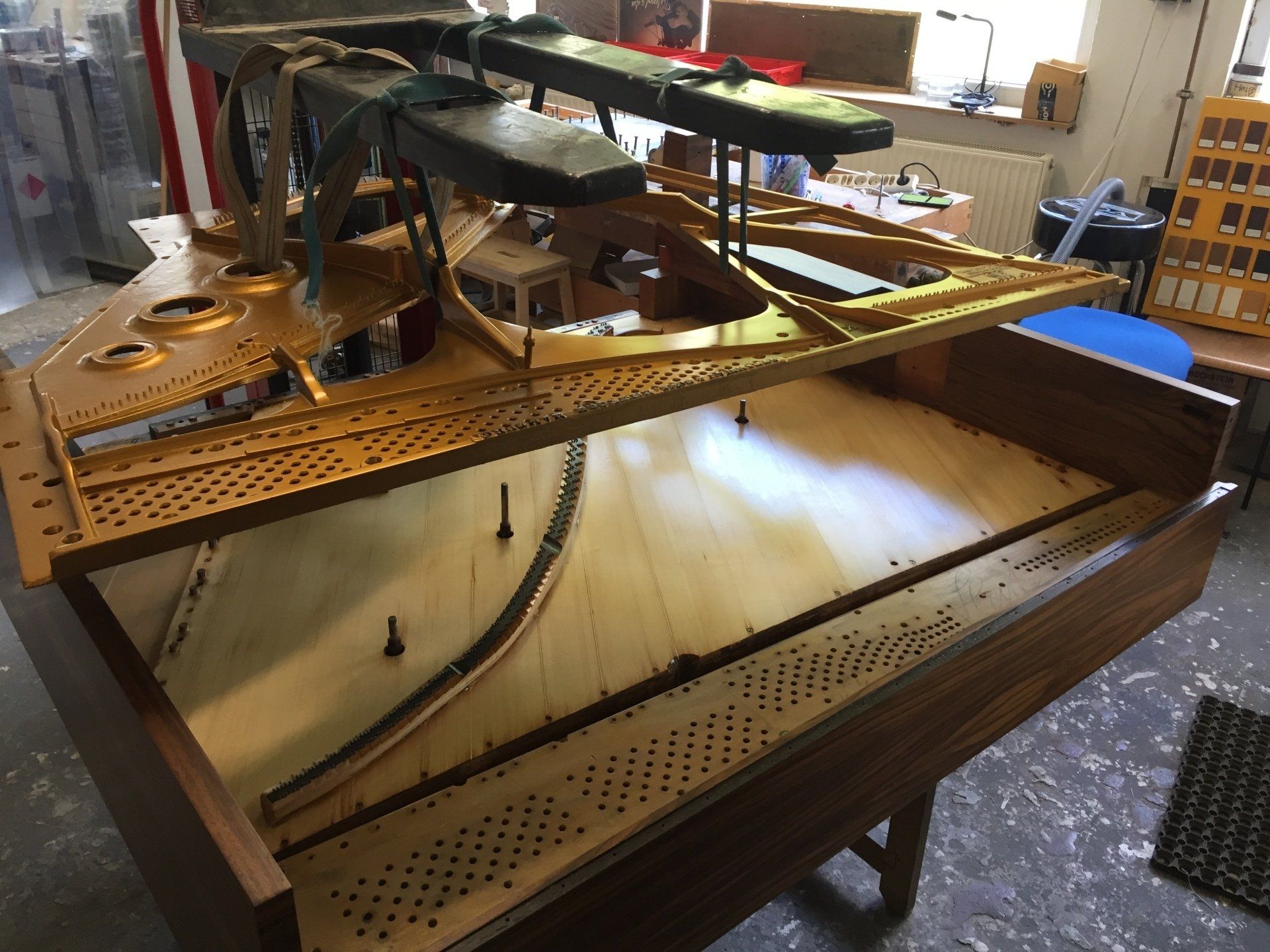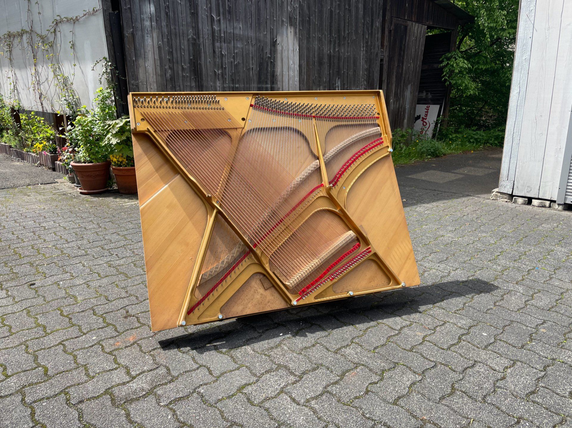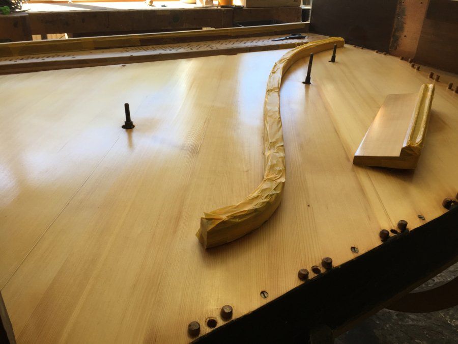 Gerade haben wir den fertig restaurierten Resonanzboden eines über 100 Jahre alten "Tietze-Klaviers" aus unserm Lackierraum geholt, um es in unserer Klavierbauwerkstatt komplett neu aufzubauen