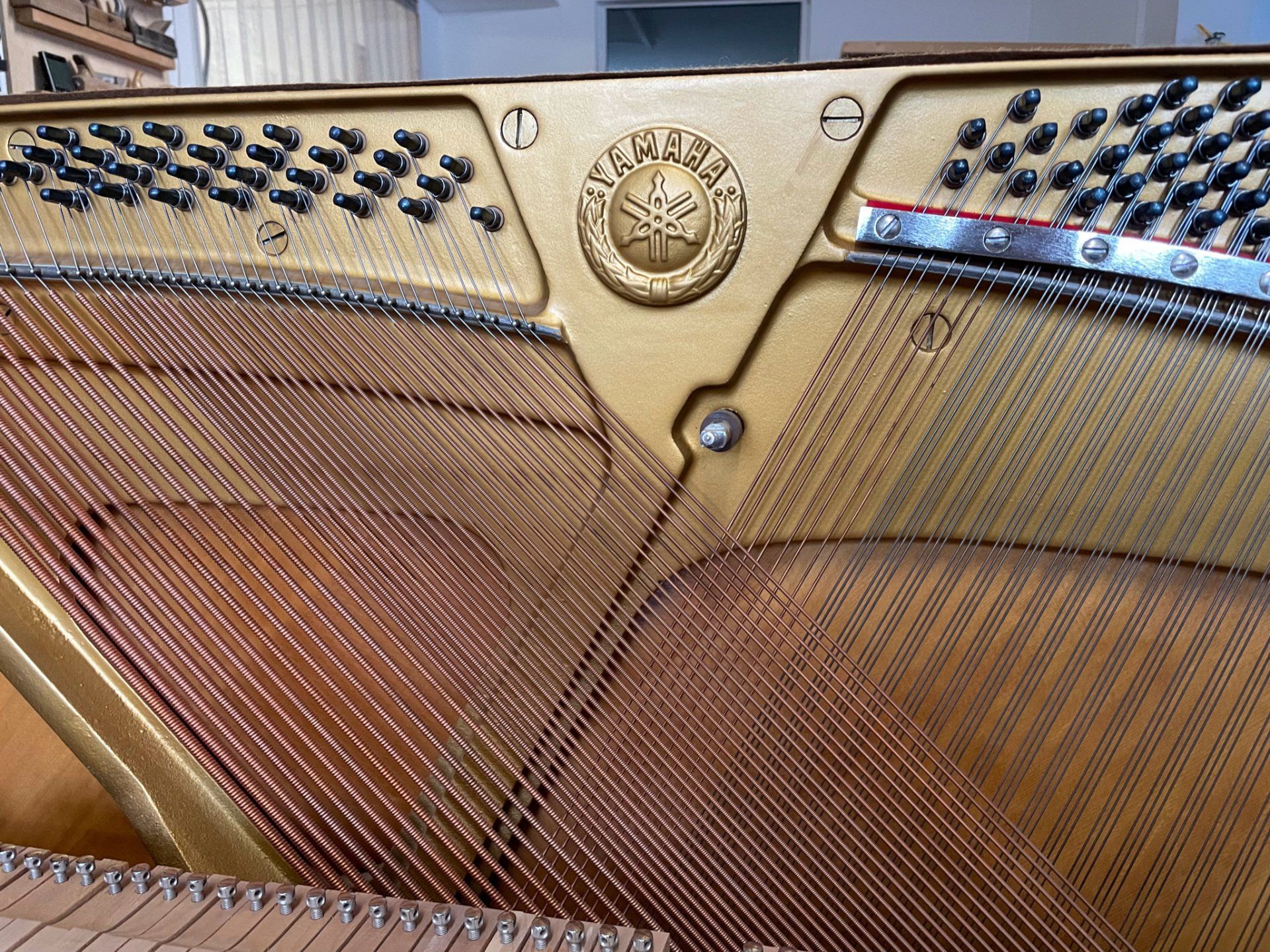 Es handelt sich bei diesem Yamaha-Klavier um ein Instrument, das in Japan gefertigt wurde und sich daher von den heute in Indonesien oder in China gefertigten Instrumenten qualitativ stark unterscheidet. Heute werden in Japan nur noch die teureren Modelle gefertigt. Es besitzt einen Resonanzboden aus massiver Fichte mit feinen Jahresringen.